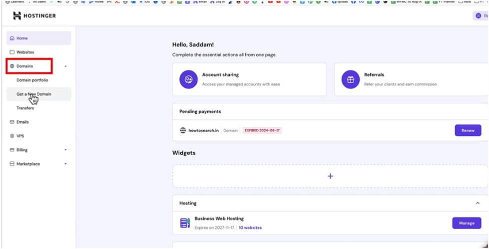 Click on Domains, and after that, click on Get a New Domain.